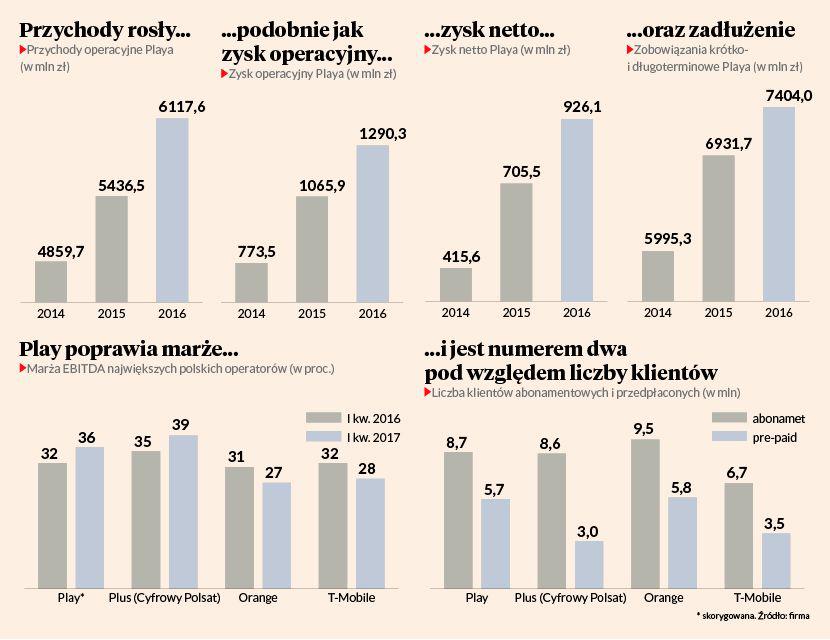 Nim opublikowano prospekt emisyjny Playa, wyceny spółki przygotowali analitycy DM PKO BP i BZ WBK, czyli instytucji oferujących akcje. Ci pierwsi oczekują, że w ciągu najbliższych pięciu lat Play konsekwentnie będzie poprawiał przychody i marże na poziomie EBITDA. W tym roku przychody mają według PKO BP wzrosnąć o 8 proc., a wynik EBITDA o 11 proc., co będzie zasługą m.in. obniżenia kosztów roamingu krajowego dzięki rozbudowie sieci własnej. Analitycy PKO BP metodą zdyskontowanych przepływów pieniężnych wyceniają Playa na 9,8-13,2 mld zł. Bardziej ostrożny jest BZ WBK, który metodą zdyskontowanych przepływów pieniężnych wycenia spółkę na 9,4 mld zł, a więc wyraźnie mniej niż przy założeniu, że w ofercie publicznej akcje zostaną objęte po cenie maksymalnej. Natomiast metodą porównawczą analitycy drugiego z oferujących wyceniają Playa na 11,5 mld zł. Zwracają uwagę na wysokie koszty obsługi długu, ale jednocześnie podkreślają, że spółka generuje gotówkę, będzie zmniejszać zadłużenie, a jednocześnie coraz hojniej dzielić się zyskiem z akcjonariuszami. Według PKO BP, po tym jak w przyszłym roku operator odda akcjonariuszom 650 mln zł, w 2019 r. do podziału będą 674 mln zł, a w 2020 r. — 750 mln zł.