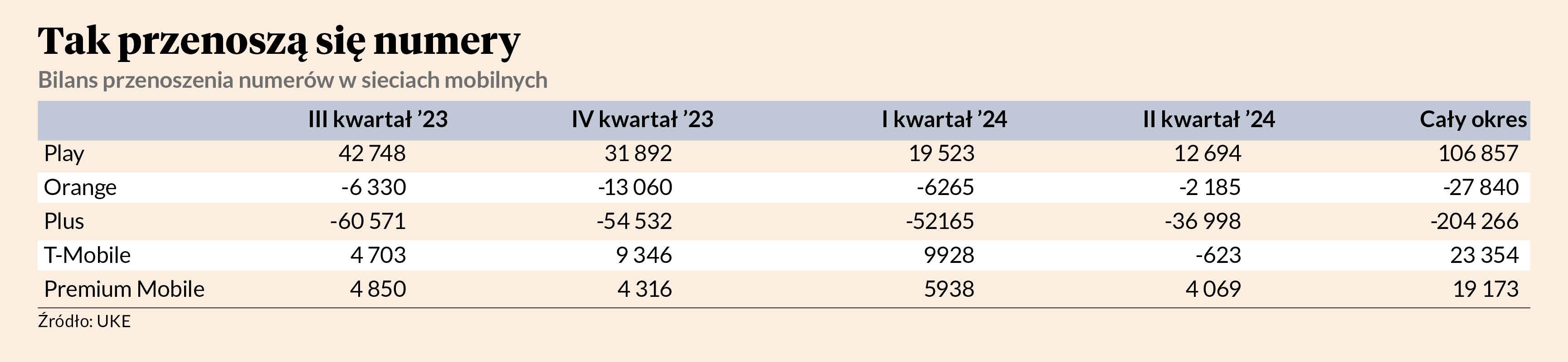 To wynik znacząco odbiegający od pozostałych dużych operatorów, którzy w drugim kwartale byli na minusie. T-Mobile, które w trzech ostatnich kwartałach miało dodatni bilans, teraz oddało konkurencji o 623 numery więcej, niż przejęło. Orange stracił prawie 2,2 tys. numerów, a Polkomtel, operator sieci Plus – niemal 37 tys. Orange i Plus stale tracą klientów na rzecz innych operatorów - według bilansu UKE, Orange skurczył się o 27,8 tys. numerów w ciągu roku, a Plus – o 204,2 tys.