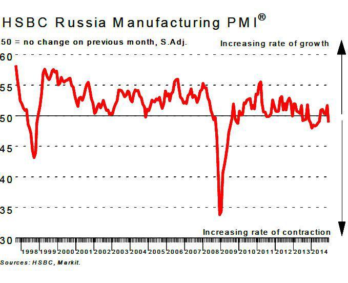 Problemy z finansowaniem działalności rosyjskich firm i spadek wartości rubla spowodowały zjazd indeksu aktywności przemysłu przetwórczego Rosji do 48,9 w grudniu wobec 51,7 w listopadzie. Grudniowy odczyt indeksu jest najniższy od maja 2014 roku. Spadł poniżej 50 po raz pierwszy od czerwca.