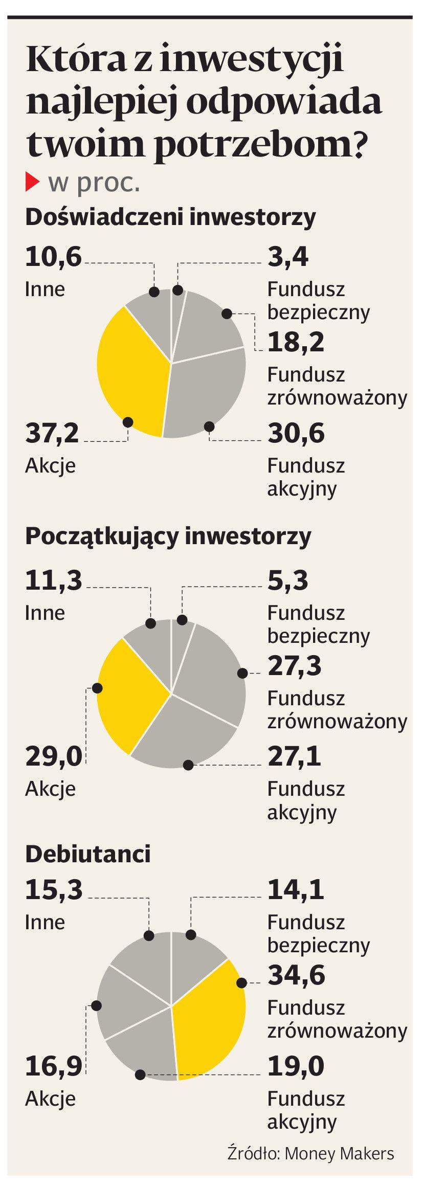 Dom maklerski Money Makers wyodrębnił trzy grupy inwestorów: inwestujących po raz pierwszy, inwestujących nie dłużej niż trzy lata oraz inwestujących dłużej niż trzy lata. Okazuje się, że inwestycyjni debiutanci mają niewiele mniejszy apetyt na zysk niż doświadczeni inwestorzy. Ponad połowa z nich jest skłonna do ryzyka i oczekuje stóp zwrotu przewyższających inflację o co najmniej 4 pkt proc. Aż 34 proc. inwestujących po raz pierwszy wskazało na fundusze o mieszanej strategii, 17 proc. wybrałoby bezpośrednią inwestycję na giełdzie, a 19 proc. kupiłoby jednostki uczestnictwa funduszy akcyjnych. Tylko 14 proc. ankietowanych przyznało, że szuka bezpiecznej przystani.