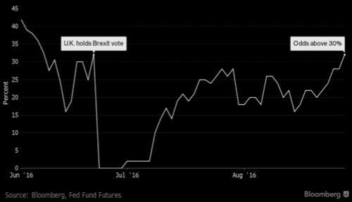 Prawdopodobieństwo podwyżki stóp już na wrześniowym posiedzeniu Fedu sięga 30 proc., oblicza agencja Bloomberg na podstawie notowań na rynku instrumentów pochodnych opartych na stopie procentowej. Ostatnio równie wysoko oceniano je tuż przed referendum w sprawie wyjścia Wielkiej Brytanii z Unii Europejskiej. Niespodziewany wynik referendum wywołał zawirowania rynkowe, które skłoniły niektóre z głównych banków centralnych do złagodzenia polityki, ograniczając też oczekiwania inwestorów na podwyżkę stóp przez Fed.
