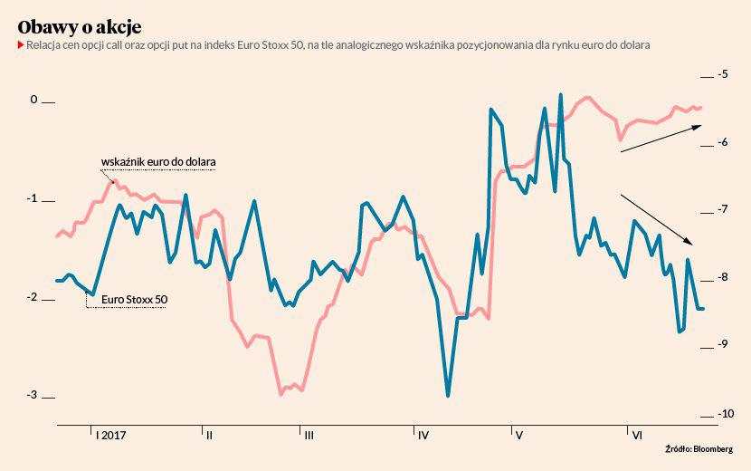 Opcje nastawione na zwyżki indeksu paneuropejskich blue chipów Euro Stoxx 50 w relacji do analogicznych instrumentów chroniących przed jego spadkiem były przed tygodniem najtańsze od kwietnia. To sygnał rosnącego wśród inwestorów popytu na zabezpieczenie przed korektą, w miarę jak Euro Stoxx 50 zmierza do zamknięcia na minusie dopiero pierwszego miesiąca w tym roku. To jednak wciąż jedyny niepokojący dla europejskich akcji sygnał.
