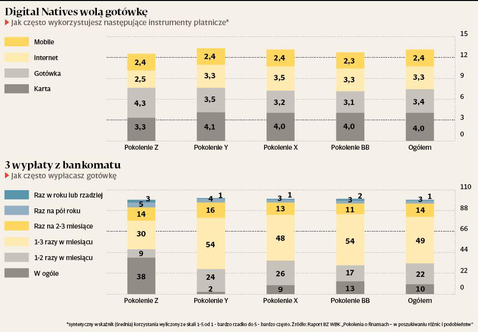 Na ich tle dość blado prezentuje się generacja Z, która przegrywa z pokoleniem dziadków niemal na każdym polu, jeśli chodzi o sposoby płatności. Karty używa 61 proc. z nich (wobec 97 proc.), a w internecie płaci 73 proc. (wobec 81 proc.). Tylko wykorzystanie aplikacji do płatności jest w tej grupie popularniejsze niż w populacji klientów o najdłuższym stażu życiowym i wynosi 42 proc. (wobec 26 proc.). To zresztą niejedyny wyróżnik generacji Z. Jak na pokolenie Digital Natives, najmłodsi klienci charakteryzują się największym wśród wszystkich badanych przywiązaniem do gotówki. Badani przez BZ WBK zostali poproszeni o wskazanie na skali od 1 do 5, jak często wykorzystują różne instrumenty płatnicze. Co ciekawe, wygrała karta (4 pkt.).