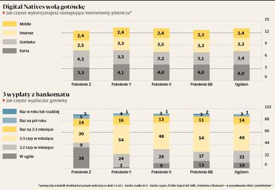 Z danych NBP wynika, że od sześciu lat systematycznie spada udział transakcji bankomatowych w transakcjach kartowych. W 2009 r. 74 proc. przypadków użycia karty przypadało na wypłaty gotówkowe z bankomatów. Na koniec ubiegłego roku ich udział zmniejszył się do 62 proc. Według badań BZ WBK, przeciętny klient pobiera gotówkę średnio 3 razy w miesiącu. Najbardziej uzależnieni od bankomatu są przedstawiciele generacji X. Tu średnia wynosi 3,5. 26 proc. klientów w tym pokoleniu wyciąga pieniądze 1-3 razy w tygodniu. To najwyższy odsetek wśród wszystkich badanych.
