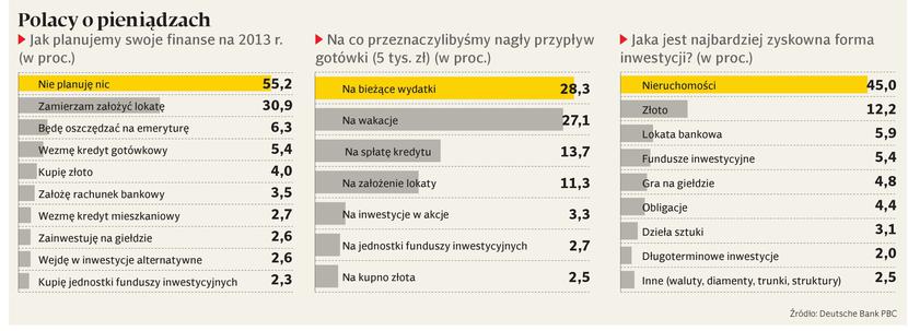 Z jednej strony większość z nas nie ma żadnych planów finansowych na 2013 r., a z drugiej mamy zamiar oszczędzać — przynajmniej tak wynika z raportu „Portret finansowy Polaków 2012. Plany na 2013 rok”, przygotowanego na zlecenie Deutsche Banku PBC.