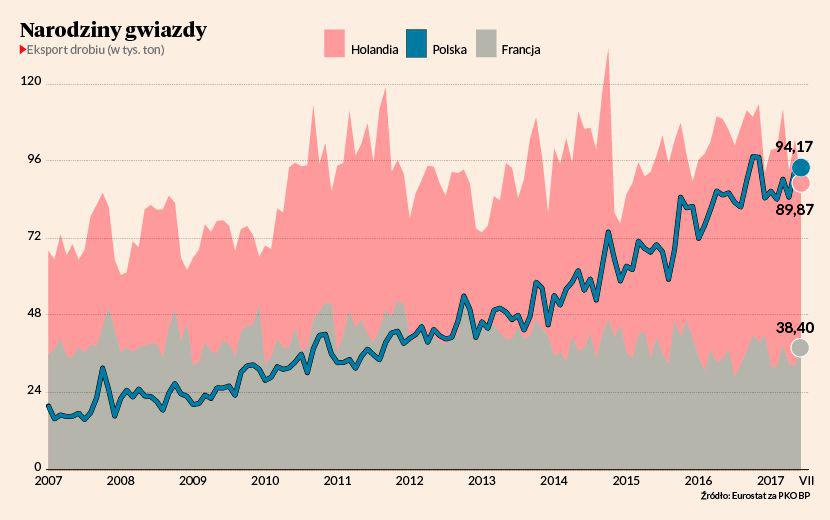 — Nasz eksport rośnie, a holenderski stracił dynamikę. W tym roku bywały już miesiące, w których wolumeny Holendrów były niższe niż nasze, co wkrótce da nam pozycję lidera drobiarskiego eksportu w UE. Nie nastąpi to prawdopodobnie w 2017 r., ale w 2018 — mówi Mariusz Dziwulski, ekspert ds. analiz rynku rolno- -spożywczego w PKO BP. Przypomina, że w zeszłym roku sprzedaż zagraniczna polskiego drobiu zwiększyła się wolumenowo o 20 proc., a w pierwszym półroczu tego roku — o 9 proc.