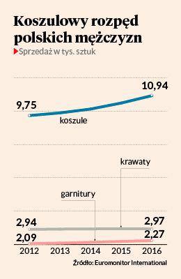 W 2016 r. Polacy kupili prawie 3 mln krawatów, 11 mln koszul z kołnierzykiem i 2,27 mln garniturów — wyliczyła firma badawcza Euromonitor International. Oznacza to, odpowiednio, 0,4 proc. spadek oraz wzrost o 4,2 i 2,4 proc. względem 2015 r.