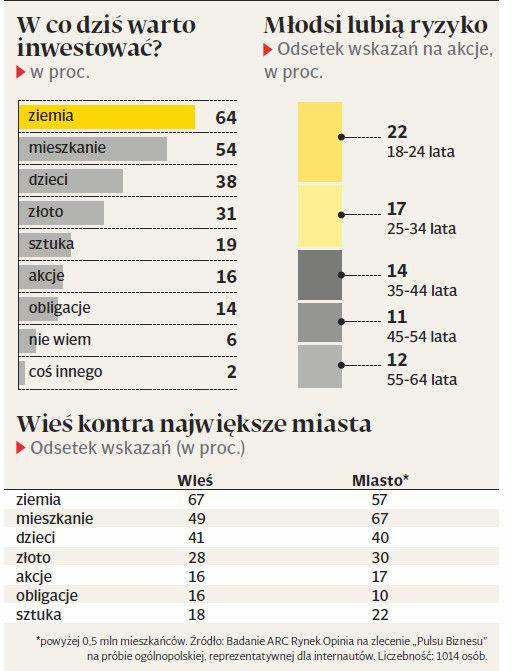 Jak wynika z badania, przeprowadzonego na zlecenie „Pulsu Biznesu” na próbie ponad 1 tys. internautów, aż 64 proc. ankietowanych uważa, że najlepszą inwestycją jest dziś ziemia. Z mieszkaniami przegrała ona tylko w grupie najmłodszych (18-24 lata) i mieszkańców największych miast. W tej grupie najłatwiej było też o zwolenników inwestowania w akcje. W sumie jest ich nieco więcej niż tych, którzy uważają, że warto dziś kupować obligacje — taka opinia jest tym częstsza, im starsza jest badana osoba. I akcje, i obligacje pobiła — co ciekawe — niszowa sztuka. Nadal wielu zwolenników ma złoto, zwłaszcza w grupie wiekowej 25-34 lata. Na kruszec częściej wskazują mężczyźni niż kobiety. Te ostatnie od złota wolą inwestycje… w dzieci.