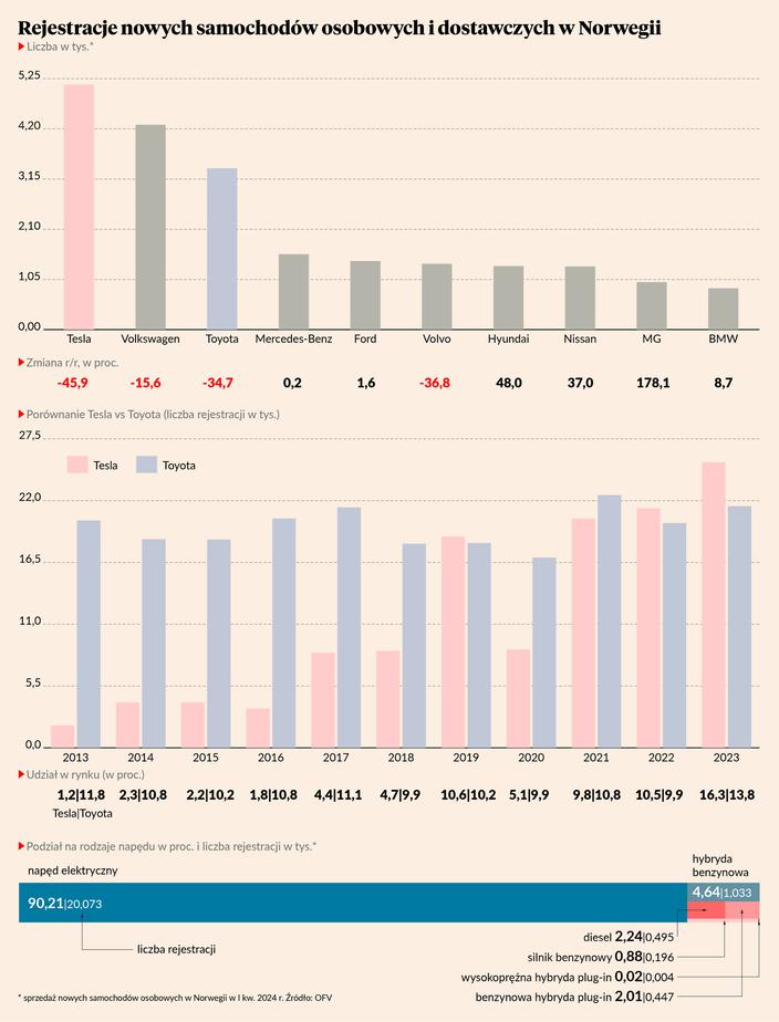 Można się spodziewać, że w związku z ogromną popularnością aut na prąd statystyki popularności marek i modeli w Norwegii drastycznie odbiegają od obserwowanych w Polsce. I tak jest. W 2023 r. w Norwegii zarejestrowano ponad 126,9 tys. nowych samochodów osobowych. Liderem była Tesla — 25,4 tys. rejestracji i udział w rynku na poziomie 20 proc., druga Toyota — blisko 16 tys. rejestracji i udział sięgający 12,4 proc., a trzeci Volkswagen — 13,7 tys. rejestracji i udział 10,8 proc.