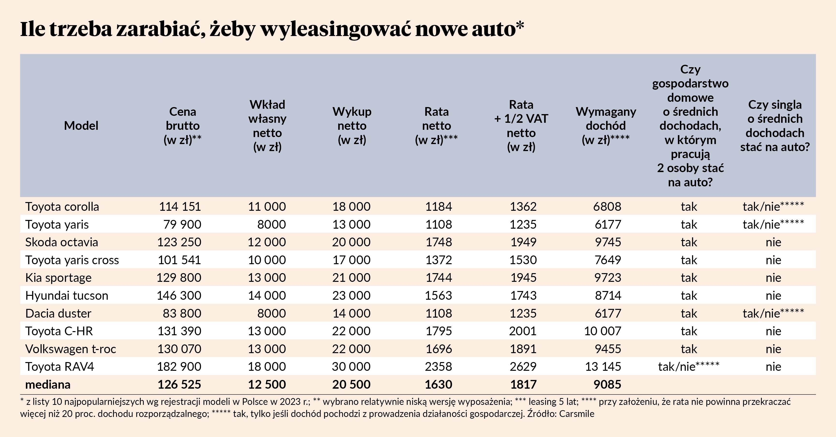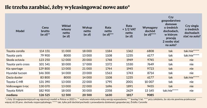 Eksperci Carsmile’a przyjęli, że zsumowane raty z tytułu różnych zobowiązań nie powinny przekraczać 60 proc. rozporządzalnego dochodu, m.in. ze względu na bardzo wysokie koszty życia. Założono ponadto, że nabywca auta wnosi wkład własny, wynoszący w zależności od modelu od 8 do 18 tys. zł netto, a także, że przeznaczy od 13 do 30 tys. zł netto na wykup pojazdu po pięciu latach, co poza miesięczną ratą też jest sporą inwestycją nabywcy. Aby „urealnić” obliczenia dochodu, jaki pozwoli na bezpieczne udźwignięcie danej raty, przyjęto, że nabywca odliczy połowę VAT-u (pominięto natomiast kwestię ewentualnych odliczeń w kosztach).