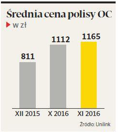 Listopada był kolejnym miesiącem wzrostu cen obowiązkowych polis OC komunikacyjnego. Jak wynika z raportu, który wspólnie przygotował „Puls Biznesu” i ogólnopolski pośrednik ubezpieczeniowy Unilink, średnia cena tego ubezpieczenia wyniosła 1165 zł. To o ponad 4 proc. więcej, niż kierowcy płacili w październiku i o 43,6 proc. więcej niż stawka na koniec grudnia 2015 roku.