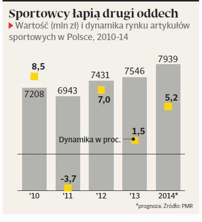 W tym roku wartość tego rynku wzrośnie o 5,2 proc., do niemal 8 mld zł, a w następnych latach będzie rosnąć średnio o 4-5 proc. Tego przynajmniej spodziewają się analitycy firmy badawczej PMR, którzy przygotowali raport „Rynek artykułów sportowych w Polsce 2014”. Wzrost wartości rynku ma być zasługą przede wszystkim szału na bieganie (ten segment rośnie o nawet 30 proc. rocznie), a także zwiększonych nakładów na sprzęt rowerowy, na który w tym roku Polacy mają wydać najwięcej w historii. Najszybciej, bo aż o 17 proc. rok do roku, rośnie sprzedaż w internecie, ale klienci i tak najczęściej robią sportowe zakupy w sklepach specjalistycznych sieci, takich jak Decathlon czy Intersport.