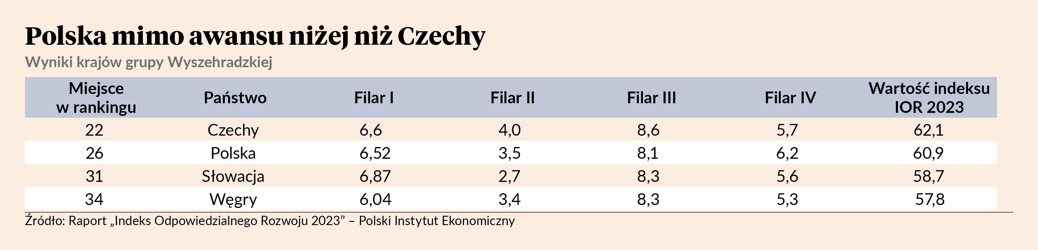 Polska awansowała o siedem miejsc, plasując się na 26. Jest to jedyny awans wśród krajów Grupy Wyszehradzkiej. To głównie efekt wzrostu dochodów rozporządzalnych oraz konsumpcji w ubiegłym roku. Wydatki konsumenckie rosły u nas bardziej na tle państw unijnych. Z czterech badanych w raporcie filarów, tylko w filarze IV (odpowiedzialność za klimat) wynik Polski przewyższa średnią UE (Polska – 6,2, UE – 5,6).
