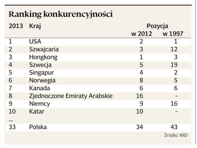 W rankingu IMD, szwajcarskiej szkoły biznesu, jesteśmy wprawdzie dopiero na 33. pozycji, ale to o oczko wyżej niż rok temu i o 10 więcej niż w pierwszej edycji 25 lat temu. Polska weszła dzięki temu do elitarnej grupy „wygranych”, czyli krajów, które poprawiły się o co najmniej 5 pozycji od 1997 r. Należą do niej także Chiny, Niemcy, Izrael, Korea, Meksyk, Szwecja, Szwajcaria i Tajwan. „Przegranych”, czyli krajów, które spadły o co najmniej 5 oczek, jest 20 i są tu m.in. Finlandia, Francja, Grecja, Węgry, Irlandia, Włochy, Luksemburg, Holandia, Portugalia, Hiszpania i Wielka Brytania. Niedawno fDi z grupy Financial Times opublikował badanie dotyczące bezpośrednich inwestycji zagranicznych, z którego wynika, że w całej Europie tylko Polska i Hiszpania miały w 2012 r. więcej projektów greenfield niż rok wcześniej. W ankiecie koniunkturalnej bilateralnych niemieckich izb handlowych przeprowadzonej w 16 krajach Europy Środkowej i Wschodniej Polska zdobyła wśród zagranicznych inwestorów najwięcej punktów w regionie.
