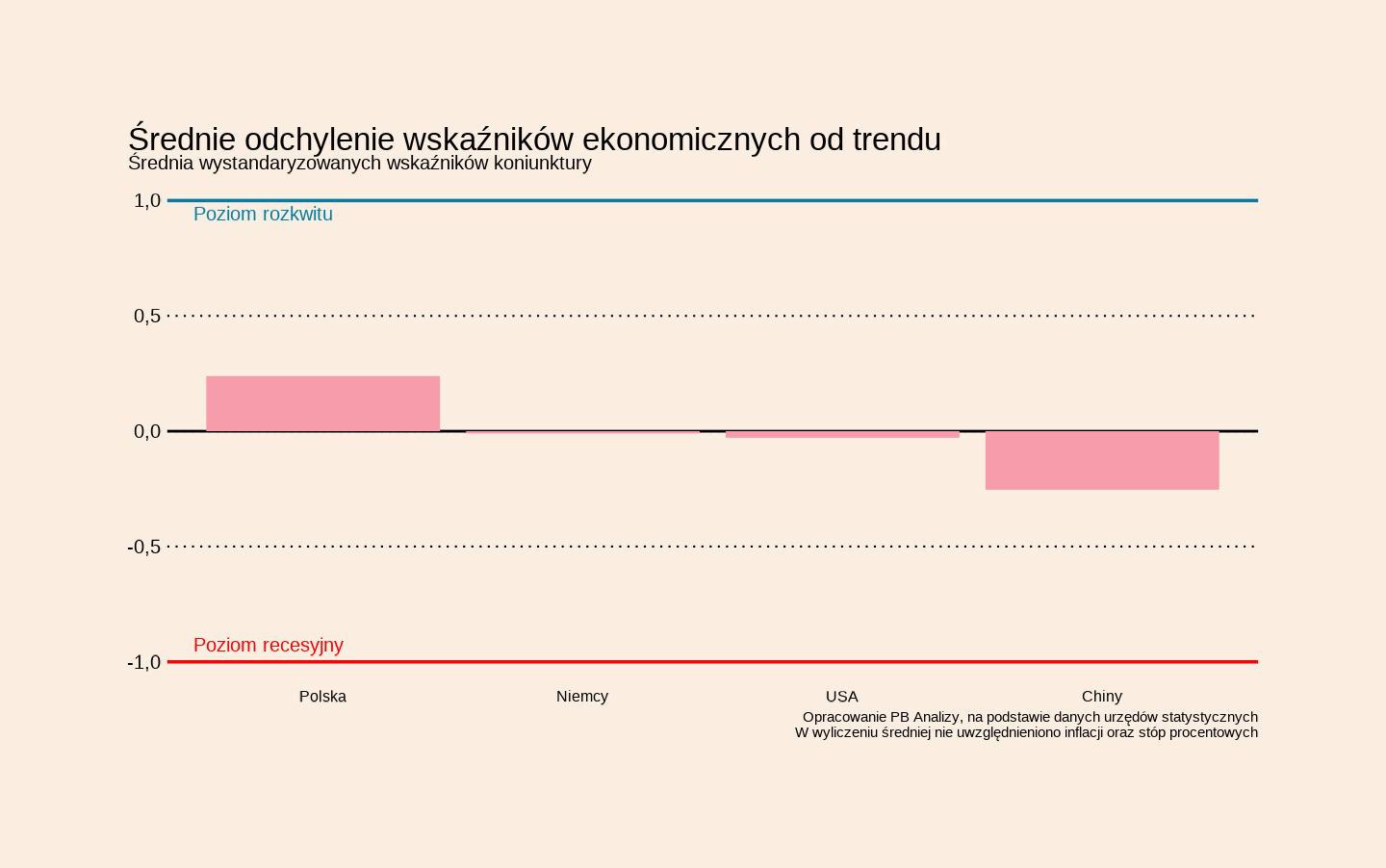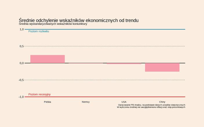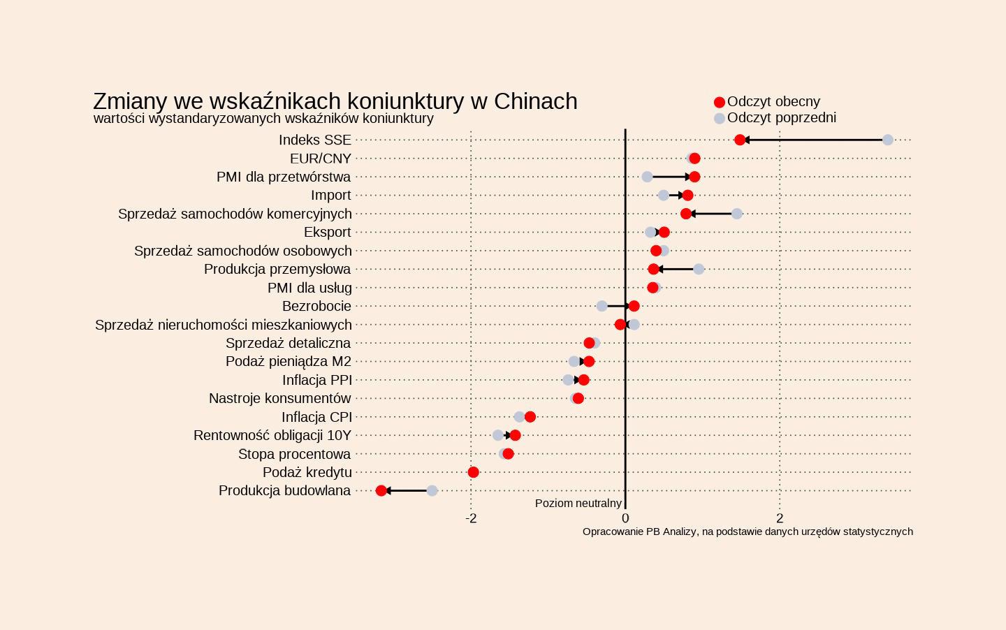 Średnia wskaźników dla Chin znajduje się 0,25 odchylenia standardowego poniżej trendu z ostatnich pięciu lat. Spośród opublikowanych ostatnio wskaźników na szczególną uwagę zasługują dane o PKB i inwestycjach.
