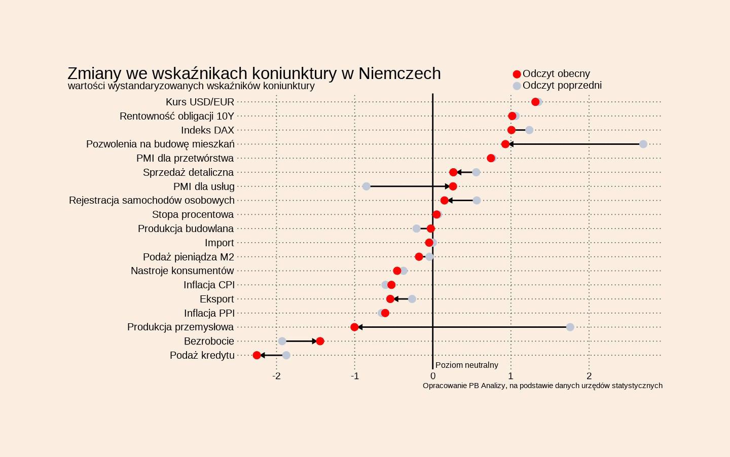 Niemiecka gospodarka znajduje się w fazie powolnego ożywienia. Średnia wskaźników dla Niemiec znajduje się dokładnie w średniej trendu z ostatnich 5 lat. W danych za wrzesień zwracają uwagę wskaźniki cen PPI i CPI.