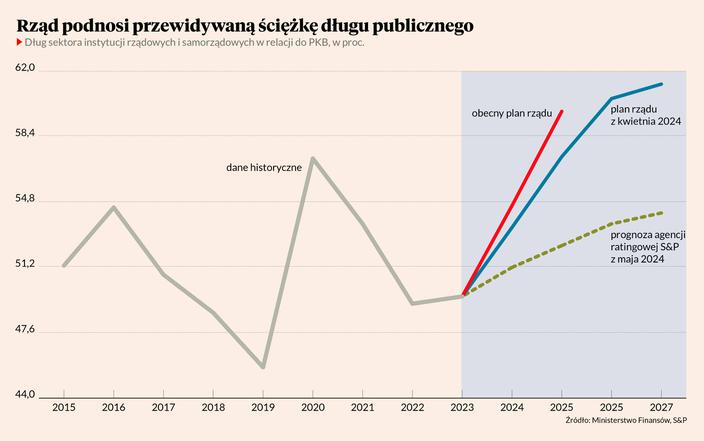 Dziś nadmienię, że wzrost wskaźników długu jest jeszcze wyższy od oczekiwań. Wedle projektu ustawy budżetowej w przyszłym roku dług całego sektora fiskalnego państwa (rząd i znajdujące się pod jego kontrolą fundusze, ubezpieczenia społeczne oraz samorządy) ma sięgnąć 59,8 proc. PKB, czyli 5,2 pkt proc. więcej niż jest planowane na obecny rok. Jeżeli rzeczywiście ścieżka będzie przebiegać w ten sposób, będzie to najwyższy przyrost od czasu, kiedy dostępne są porównywalne dane, czyli od połowy lat 90., nie licząc absolutnie wyjątkowego roku pandemii COVID-19. Jest to też wskaźnik wyraźnie wyższy, niż pokazywały wcześniejsze plany rządu oraz wszystkie prognozy zewnętrznych instytucji, w tym agencji ratingowych. Dlatego po publikacji projektu budżetu inwestorzy sprzedawali polskie obligacje skarbowe.