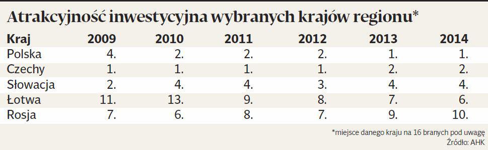4,09 pkt na 6 to może nie jest czerwony pasek, ale Polsce wystarcza, żeby być prymusem w regionie. Tyle punktów nasz kraj zdobył w badaniu atrakcyjności inwestycyjnej 16 krajów Europy Środkowej i Wschodniej przeprowadzonym wśród ponad 1,4 tys. inwestorów niemieckich. Rok temu punktów było 3,99. Drugie Czechy, które wiele lat zajmowały pierwsze miejsce i utraciły je na rzecz Polski rok temu, zdobyły 3,96 pkt, czyli tyle samo co w 2013 r.