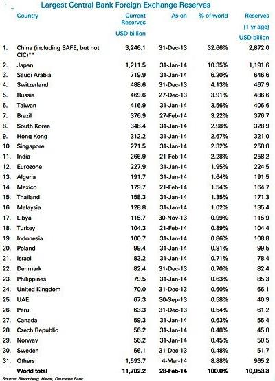 Polska zajęła 20. miejsce pod względem wielkości rezerw walutowych na świecie w rankingu Deutsche Banku, w naszym przypadku opracowanym na podstawie stanu na 31 stycznia 2014 roku. Z 99,4 mld USD Polska ma 0,81 proc. globalnych rezerw. Wielka Brytania, która zajęła 24. miejsce, miała 70 mld USD rezerw, co stanowiło 0,6 proc. ich globalnej wielkości.