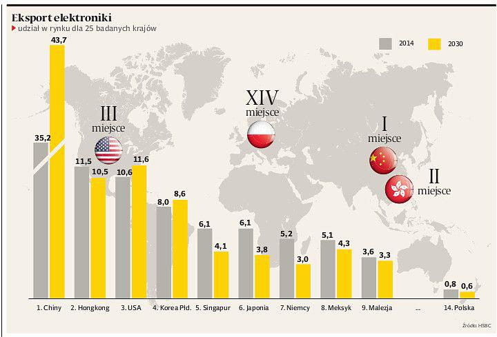 W Polsce eksport elektroniki ma rosnąć przez najbliższe 15 lat o 7 proc. rocznie. Dziś udział Polski w handlu towarami ICT nie jest duży: wynosi 0,8 proc. i ma spaść do 0,6 proc. — przewiduje HSBC. Prym wiodą Chiny, które w 2000 r. miały 7 proc. w całkowitym eksporcie ICT, w ubiegłym już 35 proc., a do 2030 r. może to być 43,7 proc. Katalizatorem będą umowy liberalizujące handel, w tym Umowa o technologii informacyjnej Światowej Organizacji Handlu, która zniosła opłaty importowe od 250 produktów teleinformacyjnych. Od jej podpisania w 1996 r. wartość eksportu produktów z tej branży na świecie się potroiła. Trwają rozmowy nad rozszerzeniem zakresu tej umowy o 200 produktów — chodzi o sprzęt telekomunikacyjny nowej generacji, urządzenia do przetwarzania danych czy elektronikę medyczną. W przypadku Polski zmniejszyłoby to obecne cła o 12 proc.