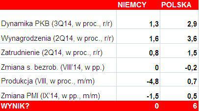 Świetnym dowodem są ostatnie dane płynące z gospodarki. Może i Niemcy mają wielokrotnie wyższy PKB niż Polska, niższe bezrobocie i więcej eksportują, ale akurat w ostatnich miesiącach przechodzą tymczasowy spadek formy. Na przykład sierpniowe dane o produkcji przemysłowej, nowych zamówieniach czy eksporcie okazały się mocno rozczarowujące, najgorsze od lat. Ekonomiści szacują, że w III kw. 2014 r. PKB Niemiec wzrósł o 1,3 proc. rok do roku.