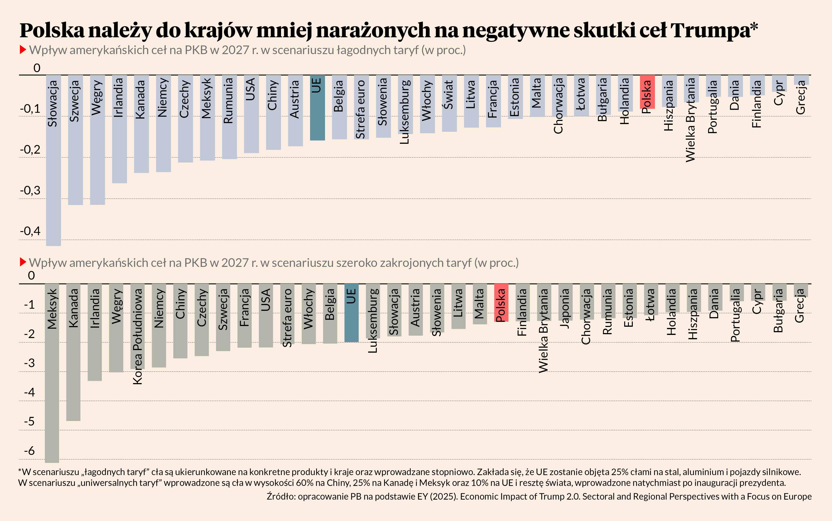 Ekonomiści EY przeanalizowali skutki dla dwóch powyższych scenariuszy, ze szczególnym uwzględnieniem unijnej gospodarki. Najważniejszy wniosek dla nas jest taki, że Polska nie jest mocno wrażliwa na amerykańskie cła. Generalnie wyłania się następujący, dość oczywisty wzorzec: najwięcej na cłach stracą małe otwarte gospodarki, bardziej uzależnione od handlu z USA. W scenariuszu łagodnych ceł straty dla Polski w postaci obniżonego PKB w 2027 r. w stosunku do scenariusza bez ceł wynoszą ok. 0,1 proc. Dla porównania, najbardziej wrażliwe są Słowacja (0,4 proc.), Szwecja i Węgry (po 0,3 proc.), Irlandia (0,25 proc.) oraz Niemcy (0,2 proc. ).