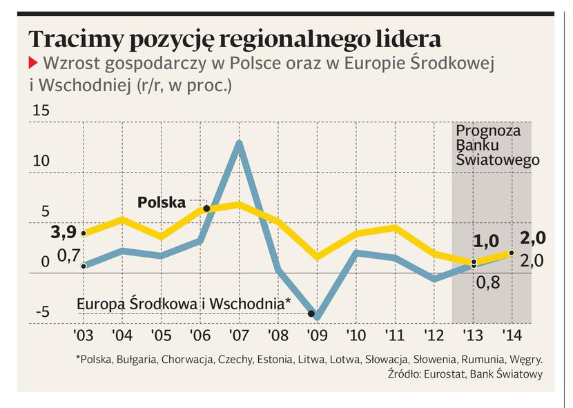W 2009 r. byliśmy nawet zdecydowanym liderem — jako jedyni uniknęliśmy recesji. Obecnie jesteśmy na odległym, szóstym miejscu, a więc dokładnie w połowie stawki. Według prognoz BŚ, w 2013 r. pięć z 11 analizowanych państw regionu odnotuje szybszy wzrost gospodarczy niż Polska (Łotwa, Litwa, Estonia, Bułgaria i Rumunia).