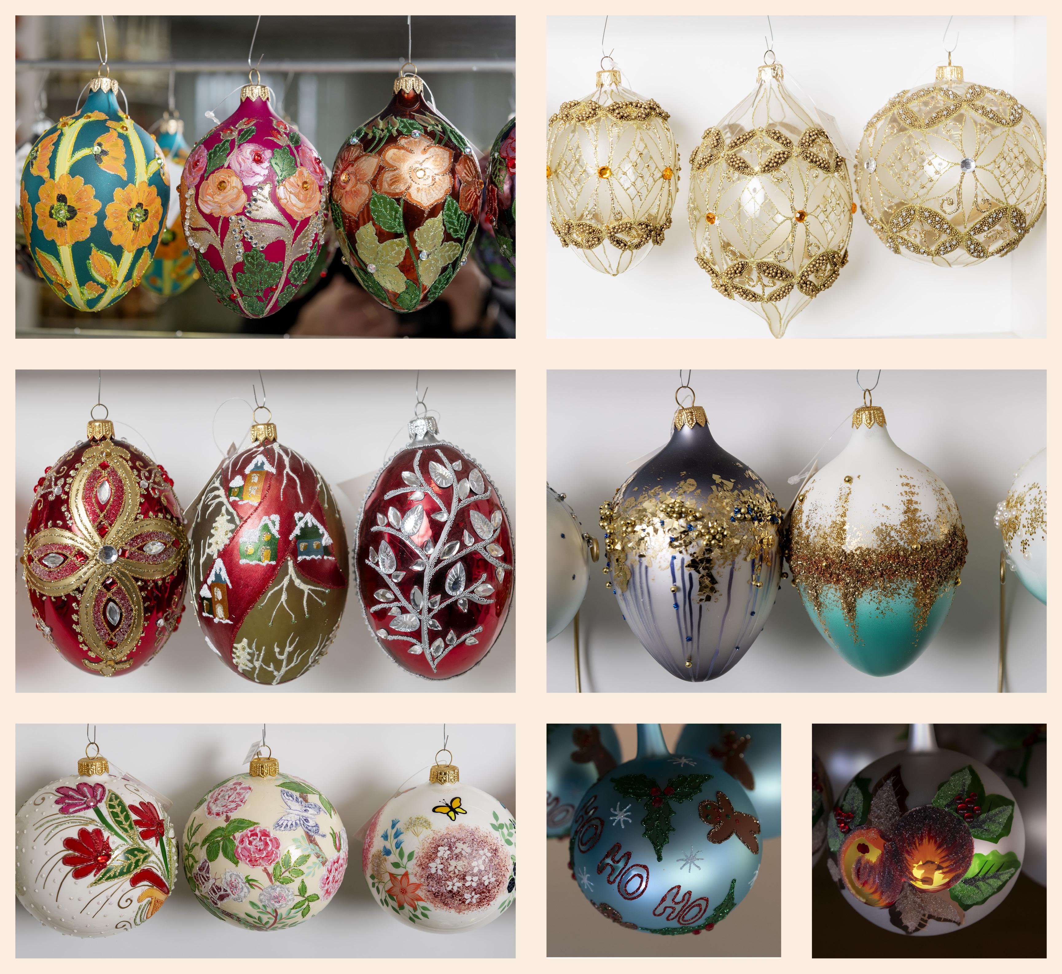 Większość wzorów jest prezentowana we wzorcowni – są kule, jaja Fabergé, domki, czuby na choinkę, muchomorki, serca, szyszki. Stała załoga to ponad 30 fachowców, wielu związanych z firmą od ponad 20 lat. Poważne funkcjonowanie na rynku międzynarodowym firma zaczęła właśnie od bombek w kształcie jajek, ale w portfolio ma około tysiąca form i ponad 20 tys. wzorów.