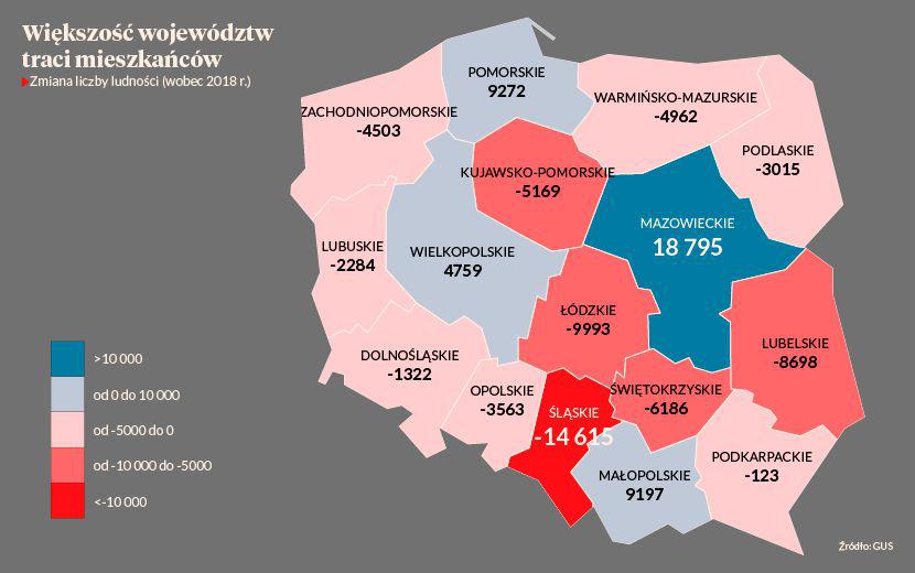 Według GUS w 2018 r. ludność Polski zmniejszyła się o 22 410 osób, co jest znaczącym spadkiem, biorąc pod uwagę, iż w 2017 r. odnotowano wzrost o 556 mieszkańców. Jedynie w czterech województwach liczba ludności się zwiększyła — w małopolskim, mazowieckim, pomorskim i wielkopolskim. Liderem w tym gronie jest Mazowsze, którego ludność wzrosła o 18 795 osób.