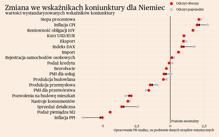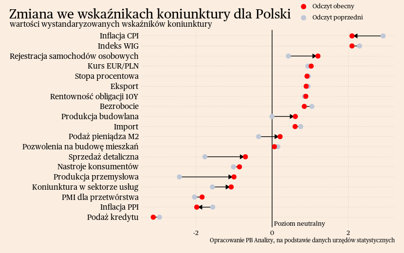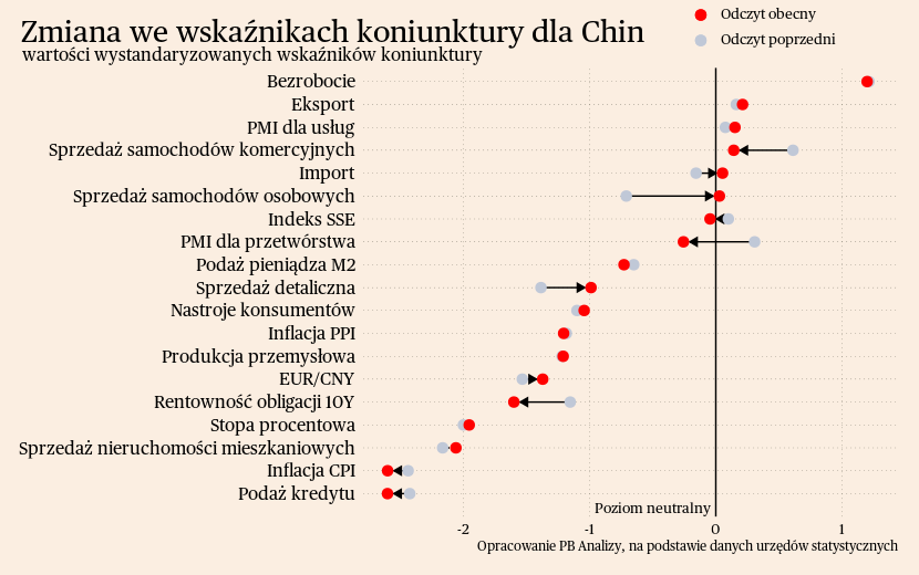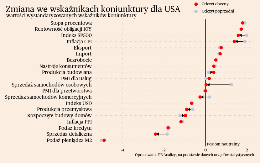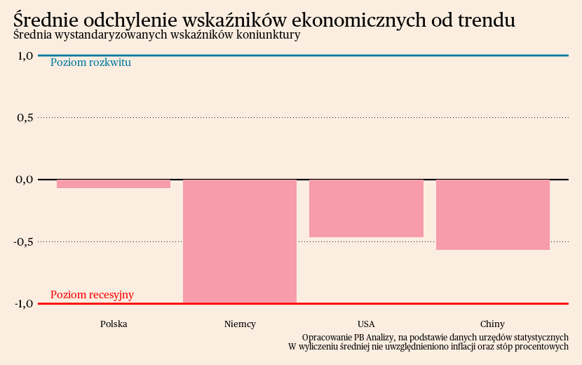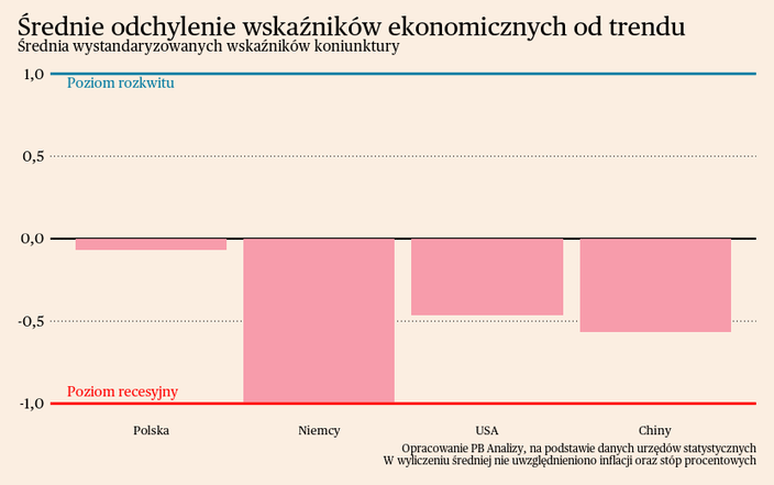 W każdym tygodniu aktualizujemy informacje o kondycji światowej gospodarki przez pryzmat 80 wskaźników z czterech gospodarek – Polski, Niemiec, Stanów Zjednoczonych i Chin. Wszystkie analizowane przez nas wskaźniki można obserwować i pobierać na naszej platformie danych PB Analizy. W analizie dane podajemy w wystandaryzowanej dynamice rocznej oraz w wystandaryzowanym odchyleniu od poziomu referencyjnego. Dzięki temu możemy porównywać dane o różnych cechach statystycznych i pokazywać odchylenia od długookresowego trendu.