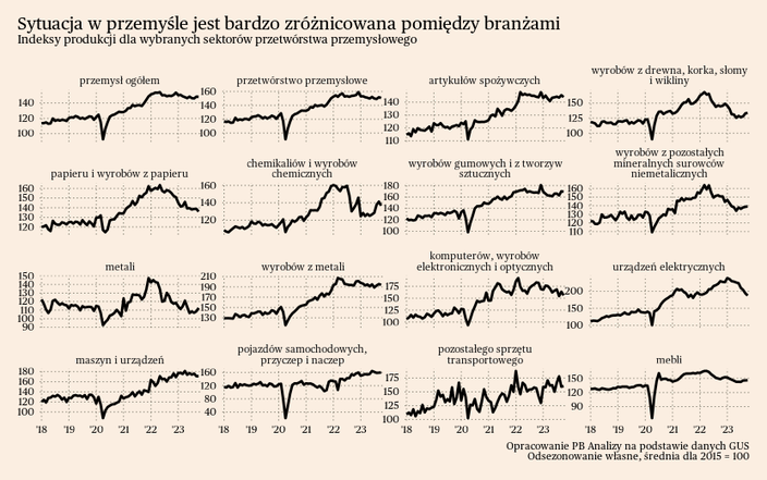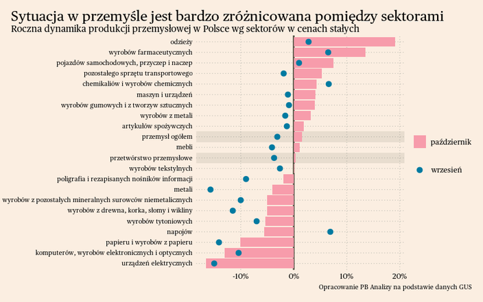 Mniejsza skala odbicia wystąpiła w produkcji przemysłowej, gdzie dominują stagnacja i słabe nastroje. Produkcja przemysłowa wzrosła w zeszłym miesiącu o 1,6 proc. r/r, a przetwórstwo przemysłowe o 0,3 proc. Warunki działalności są natomiast bardzo zróżnicowane pomiędzy branżami. Przemysł znajduje się pod wpływem spadających cen nośników energii, jednakże z sektorów energochłonnych wyraźne odbicie widać jedynie w branży chemicznej. W pozostałych dominującym czynnikiem jest odwrócenie cyklu zapasów, które zmniejsza popyt na dobra pośrednie. Produkcja w pozostałych branżach znajduje się w stagnacji. Najważniejszym problemem dla producentów jest słaby popyt. Szczególnie negatywnie na polskie przetwórstwo wpływa sytuacja w Niemczech. Bez polepszenia koniunktury za zachodnią granicą, może być trudno rozruszać produkcję nad Wisłą.