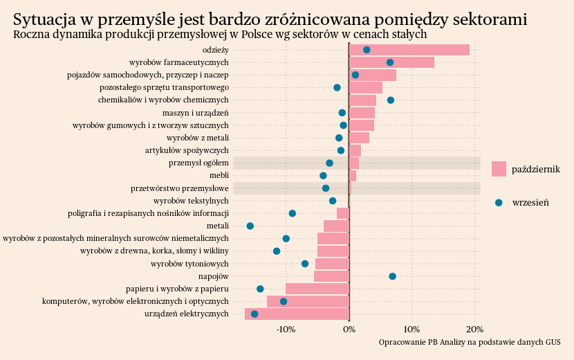 Wpływ stagnacji w sprzedaży widać także w indeksie cen produkcji sprzedanej przemysłu. Indeks PPI spadł w październiku o 4 proc. r/r, przy czym spadek indeksu dla samego przetwórstwa wyniósł 7,5 proc. r/r. Największe spadki cen notowane są w sektorach energochłonnych oraz u producentów dóbr pośrednich, czego źródłem jest odwrócenie cyklu zapasów. W większości pozostałych branż również spadają ceny, co świadczy o tym, że w Polsce dezinflacja zaczęła się już zataczać szerokie kręgi i nie ogranicza się tylko do sektorów energochłonnych.