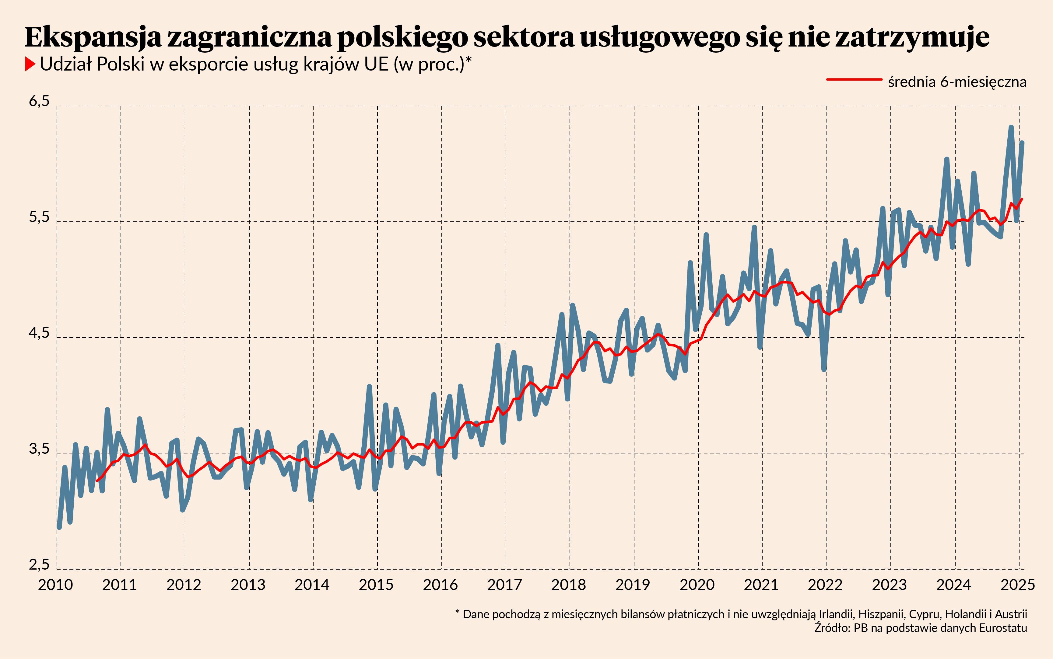 Obraz usług można zobaczyć w danych z bilansu płatniczego Polski i innych krajów UE. W styczniu eksport usług z Polski zwiększył się aż o 10,3 proc. rok do roku, czyli wyraźnie szybciej niż średnio w 2024 r., kiedy wzrost wynosił przeciętnie 7,2 proc. W dołku w połowie zeszłego roku ta dynamika obniżyła się do 5 proc. Teraz obserwujemy więc ożywienie. Są to na razie wstępne dane, które będą weryfikowane w kolejnych kwartałach.