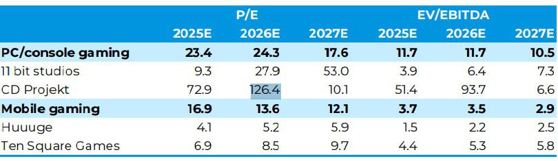 Analitycy BM mBanku w raporcie datowanym na 9 lipca 2025 r. odnieśli się do sytuacji w polskiej branży gamingowej. W ich opinii obraz jest mieszany. Mimo udanego półrocza specjaliści ostrzegają przed spowolnieniem – wiele spółek wykorzystało już większość możliwości. Tylko nieliczne wyróżniają się na tle dojrzałego rynku, który zdaje się czekać na świeże impulsy. Widzą szanse głównie w przypadku Huuuge, podczas gdy inne firmy stają przed większymi wyzwaniami. Podkreślają przy tym, że kursy walut mają istotny negatywny wpływ na ich wyceny, a każde odwrócenie trendu zapewniłoby zauważalne wsparcie.