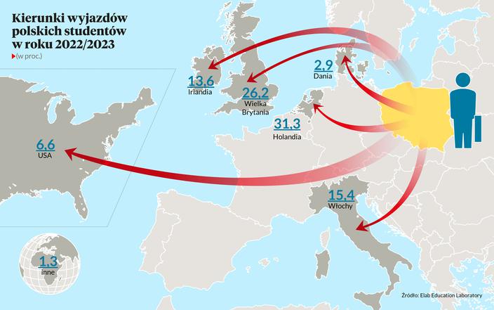W roku akademickim 2022/2023 Wielką Brytanię na miejsce do studiowania wybrało 26 proc. Polaków, Włochy 15 proc. Największą popularnością wśród absolwentów polskich szkół średnich cieszyły się studia w Holandii, do której wyjechało 31 proc. chcących studiować za granicą.