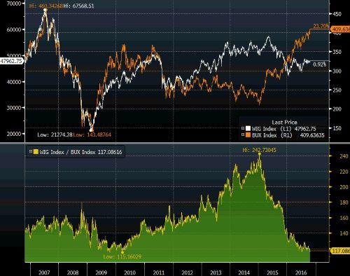Od szczytu ze stycznia 2015 r. wskaźnik siły relatywnej WIGu oraz węgierskiego indeksu BUX załamał się o 52 proc. BUX znalazł się w środę najwyżej od 9 lat, podczas gdy WIG nie odrobił jeszcze nawet połowy strat z kulminującego w styczniu 27,3-procentowej przeceny.