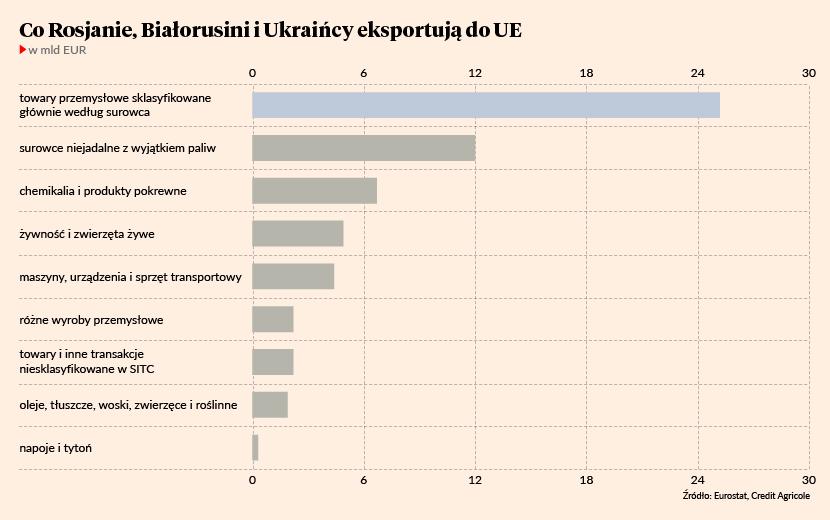 Oczywiście gros eksportu ze Wschodu do UE to paliwa i nośniki energii. Wartość pozostałego importu z Białorusi, Rosji i Ukrainy do unijnych państw (z wyłączeniem Polski) też jednak jest niebagatelna - w zeszłym roku, według danych Eurostatu, wyniosła 66,7 mld EUR. Ponad 40 proc. to sprzedaż „towarów przemysłowych sklasyfikowanych głównie według surowca”, 20 proc. - „surowców niejadalnych z wyjątkiem paliw”, a „żywność i zwierzęta żywe” oraz „maszyny, urządzenia i sprzęt transportowy” mają 7-8-procentowe udziały.