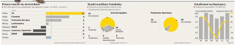 Na europejskim tle polski rynek loteryjny wypada jednak blado. TS na koniec 2012 r. sprzedawał zakłady w ponad 12,5 tys. punktów (o 3,2 proc. mniej niż rok wcześniej), co oznacza, że na jedną kolekturę przypada ok. 3 tys. mieszkańców. Gorzej jest tylko w Niemczech i Rumunii, a kontynentalna średnia to kolektura na 1,4 tys. mieszkańców. Najgęstszą sieć mają Włosi — działa tam aż 150 tys. punktów sprzedaży loterii, czyli jeden na 300 osób. Polska spółka przekonuje jednak, że jej sieć jest „dużo bardziej efektywna” od konkurentów w regionie — pojedyncze punkty w Polsce notują dużo wyższą sprzedaż niż ich odpowiedniki w Czechach czy na Słowacji.