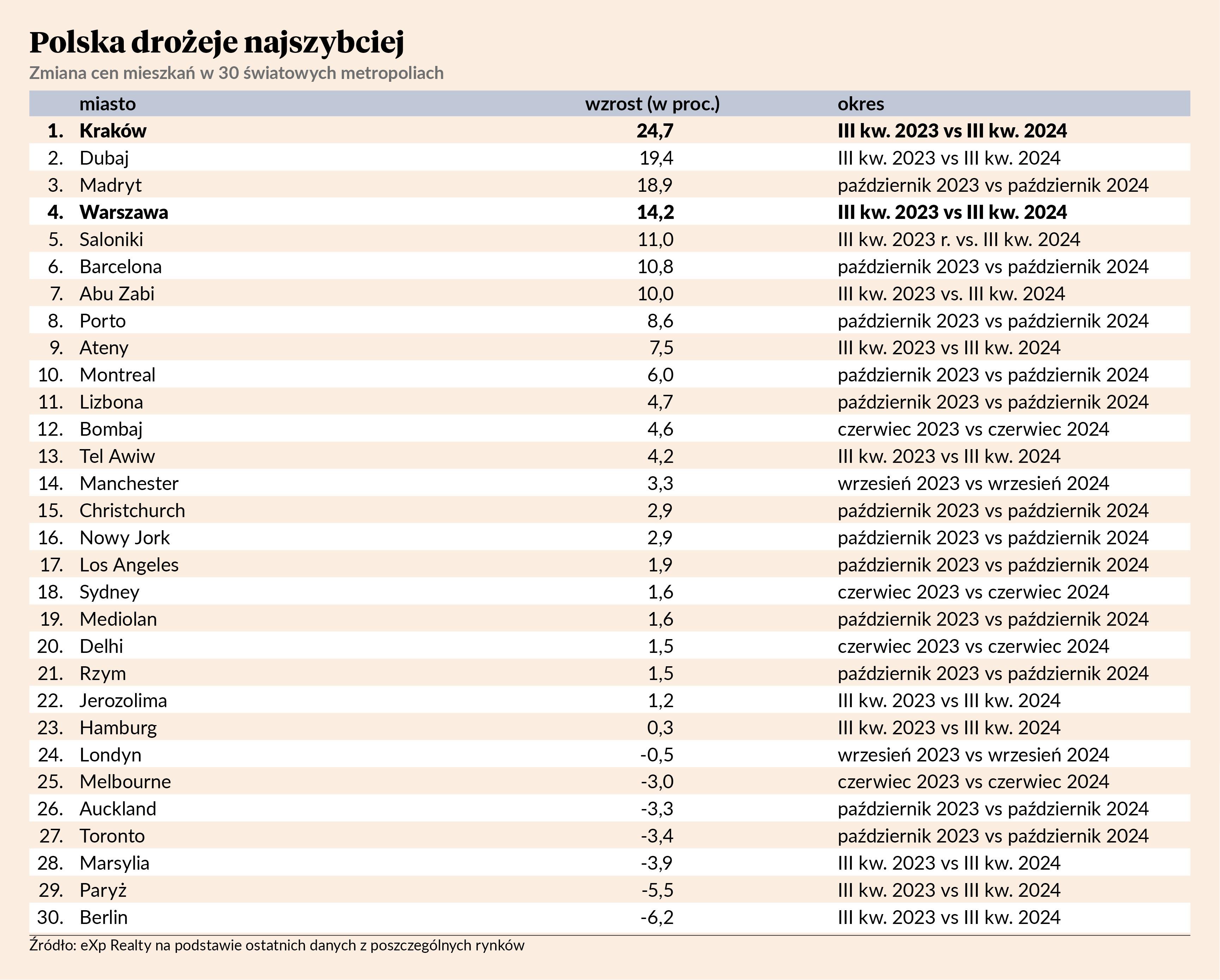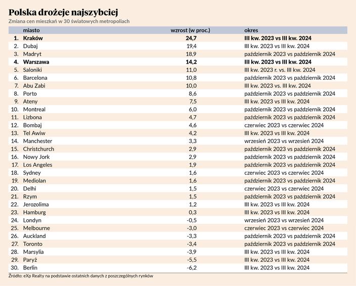 Najnowsze informacje z polskiego rynku mieszkaniowego wskazują na delikatną miesięczną stabilizację cen za metr. Jeśli jednak spojrzymy na tempo ich wzrostu w ostatnim roku, to okazuje się, że polskie miasta są w światowej czołówce. Z analizy cen nieruchomości przeprowadzonej przez firmę eXp Realty w 30 metropoliach wynika, że największy wzrost — niemal o 25 proc. — zarejestrowano w Krakowie. Drugie miejsce w zestawieniu zajął Dubaj ze zwyżką o 19,4 proc., a trzecie Madryt, w którym ceny poszły w górę o 18,9 proc. Co ciekawe, już na czwartym miejscu znalazło się kolejne polskie miasto. Chodzi o Warszawę, w której ceny urosły o 14,2 proc.