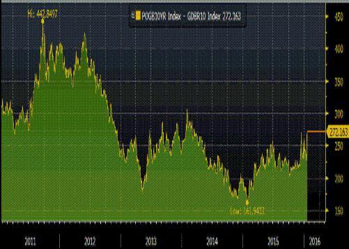 Różnica w rentownościach 10-letnich obligacji Polski i Niemiec. Źródło: Bloomberg.