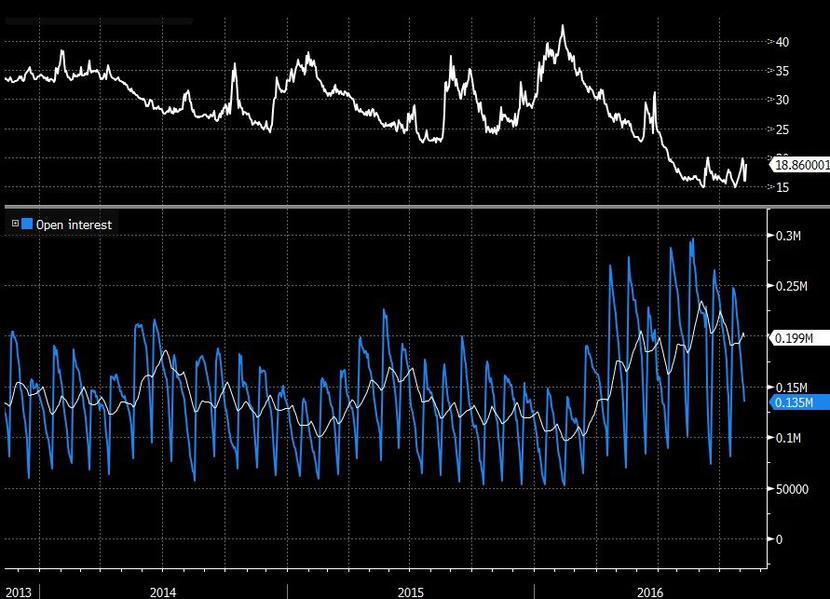 Notowania indeksu VIX (wykres górny), na tle ilości wystawionych na niego kontraktów wraz ze średnią za ostatnie 15 sesji (wykres górny). Źródło: Bloomberg.