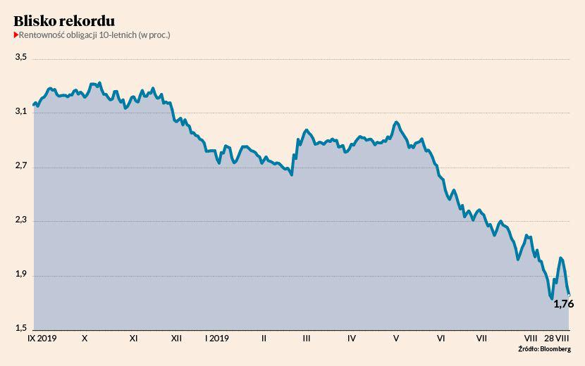— Sierpniowy dołek trudno będzie pokonać. Oczekuję, że rentowności polskich obligacji będą się wahać w przedziale 1,7- -1,9 proc., przy czym wycena naszego długu będzie pochodną wycen długu państw wysokorozwiniętych. Bardzo łagodna politykaamerykańskiego Fedu i Europejskiego Banku Centralnego wpływa jednak na cały świat. Myślę, że szybciej rentowności obligacji amerykańskich spadną poniżej 1,2 proc. [obecnie około 1,5 proc. — red.] niż polskich zejdą do 1,5 proc. [obecnie około 1,75 proc.] — tłumaczy Mariusz Zaród.