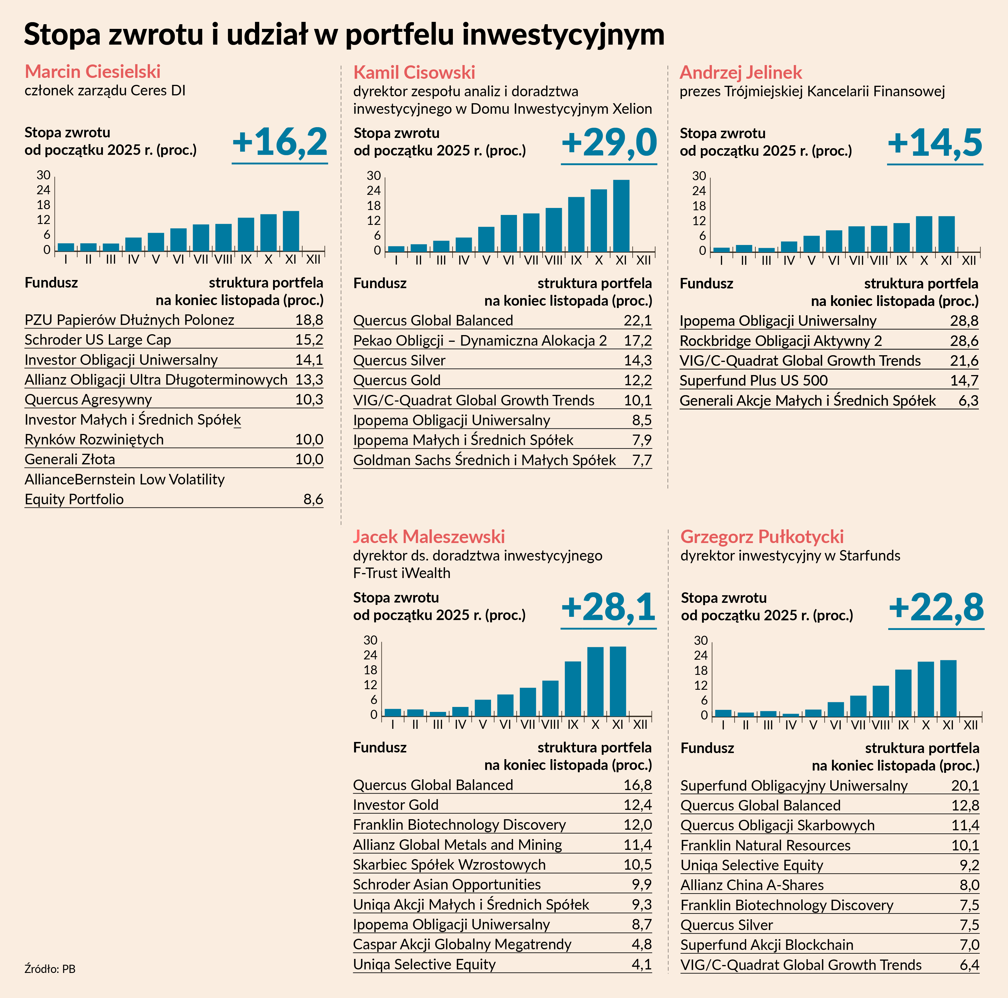 Listopad okazał się bardzo zróżnicowany pod względem stóp zwrotu, jakie osiągnęły portfele funduszy zaproponowane na 2025 r. przez przedstawicieli firm doradczych. Najgorszy w ogóle nie poprawił wyniku, jaki osiągnął od początku roku, najlepszy poprawił go o 4,8 pkt proc. Stało się to udziałem kompozycji funduszy stworzonej przez Kamila Cisowskiego, dyrektora zespołu analiz i doradztwa inwestycyjnego DI Xelion. Duża w tym zasługa fundusz Quercus Silver. W ciągu ostatniego miesiąca zarobił on dla klientów prawie 20 proc. Jego waga w portfelu Kamila Cisowskiego przełożyła się zaś na wynik całej kompozycji. Zakładając, że wycena tego funduszu nie zmieniłaby się w stosunku do końca października, stopa zwrotu z całego portfela wyniosłaby 26,2 proc. licząc od początku 2025 r. Dzięki Quercusowi Silver dobiła jednak do 29 proc.
