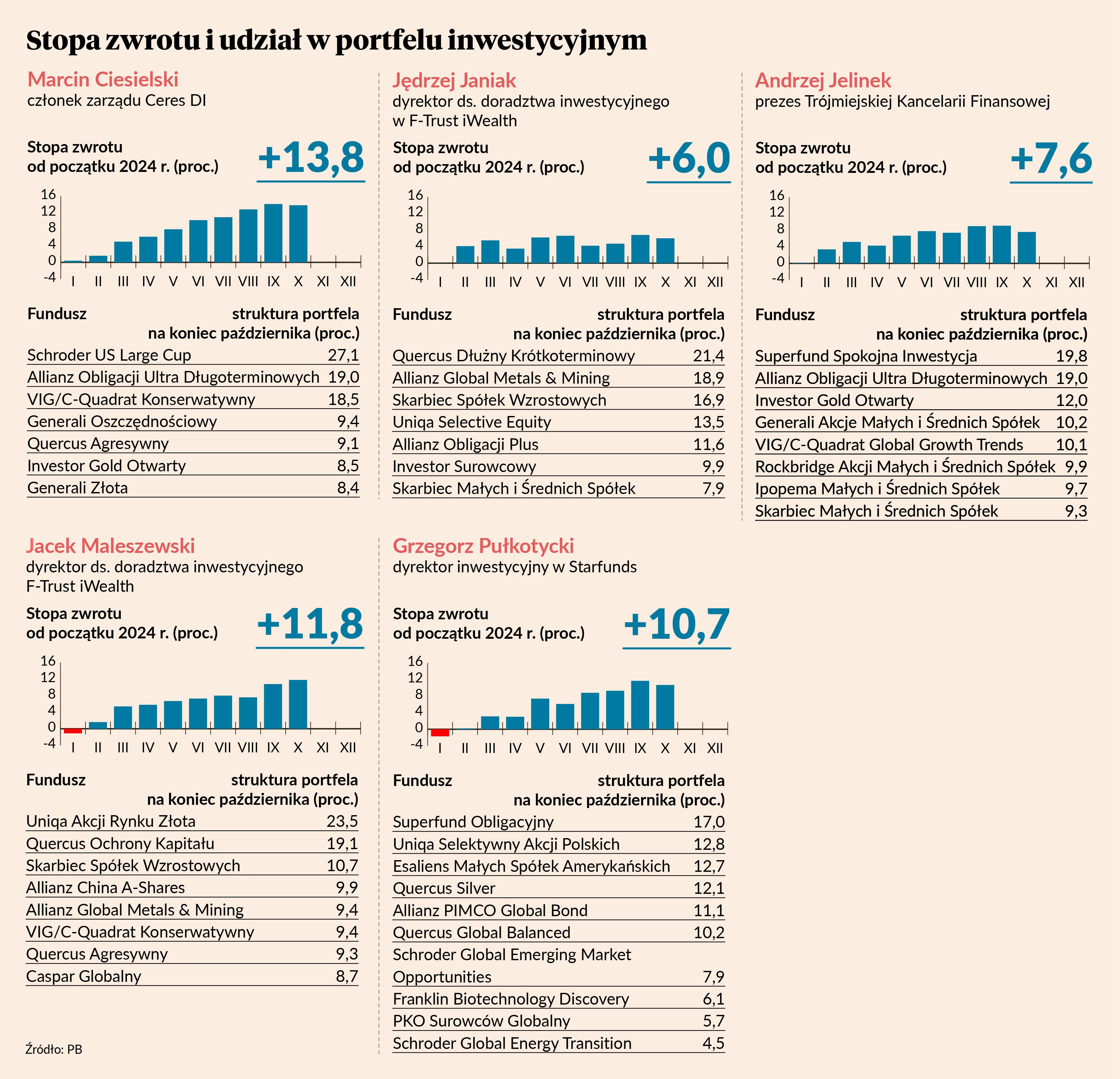 Po zmianie przeprowadzonej pod koniec października Grzegorz Pułkotycki może już tylko obserwować rozwój sytuacji na rynkach finansowych, czekając na to, jaki wynik osiągnie jego portfel na koniec 2024 r. Od końca maja w takiej sytuacji jest już Jędrzej Janiak, drugi z dyrektorów ds. doradztwa inwestycyjnego F-Trust iWealth. Obecnie jego portfel notuje najgorszy wynik.