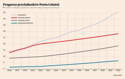 Polskie porty przygotowują się do budowy terminali, a nawet nabrzeży. Jednym z najbardziej zaawansowanych w realizacji bieżących inwestycji i przygotowaniu nowych jest port gdański. Łukasz Greinke, prezes Zarządu Morskiego Portu Gdańsk, prognozuje, że do 2030 r. trzykrotnie wzrosną przeładunki (patrz wykres).