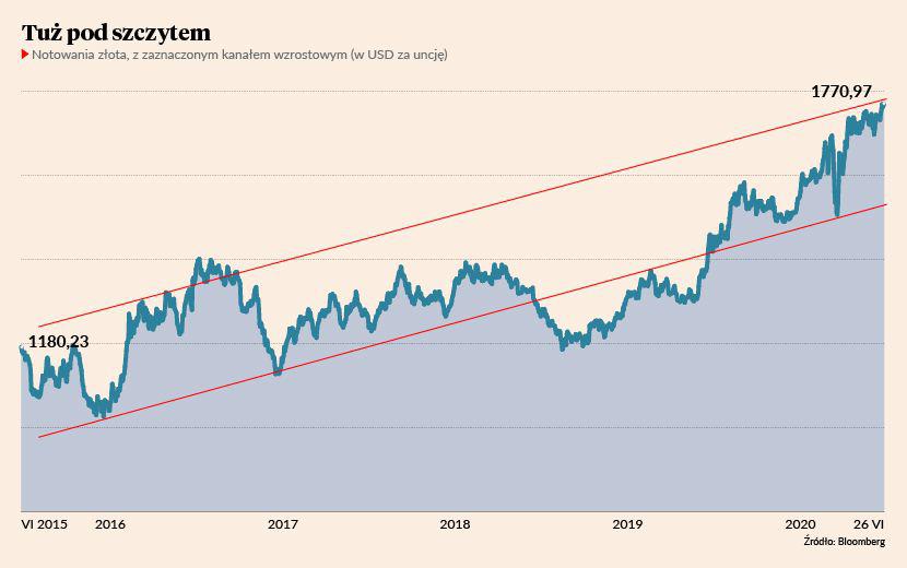 W ubiegłym tygodniu ceny złota znalazły się najwyżej od jesieni 2012 r., kiedy rynki dopiero wychodziły z zawirowań związanych z kryzysem w strefie euro. Notowania są na najlepszej drodze do zamknięcia kwartału 12,5-procentową, największą od ponad czterech lat zwyżką, do czego walnie przyczyniły się zdecydowane działania banków centralnych, zmierzające do stymulacji gospodarek. W odpowiedzi na rozlanie się epidemii COVID-19 po świecie Fed wznowił nieograniczony skup aktywów, co zwiększa płynność na globalnych rynkach aktywów. O tym, że duża część tej płynności kierowana jest na rynek złota, świadczą napływy do opartych na kruszcu funduszy ETF — ich aktywa sięgnęły w skali globu najwyższej wartości w historii.