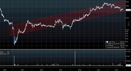 Równo po 13 miesiącach od wyjścia na najwyższy poziom od 2007 r. (473,44 zł) notowania producenta urządzeń do przesyłu energii mają szansę zatrzymać zniżki. Wszystko przez zbliżanie się kursu do dolnego ograniczenia długoterminowego kanału wzrostowego. Leży ono na wysokości 292 zł, a to sugeruje, że potencjał zniżkowy z obecnie notowanego pułapu 312 zł nie przekracza 6 proc.