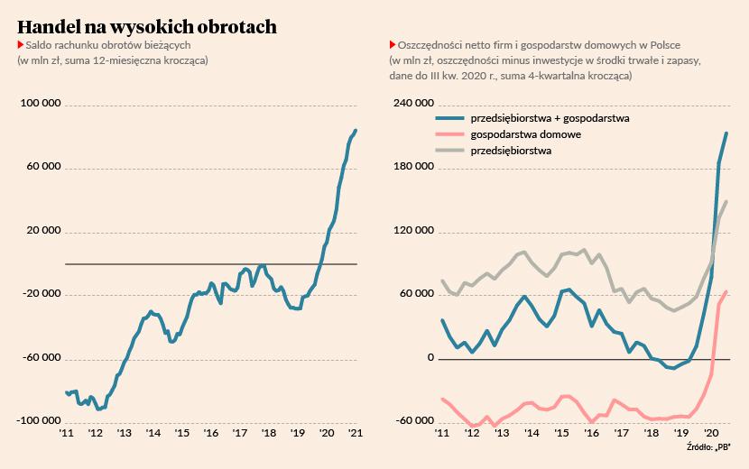 W styczniu Polska odnotowała nadwyżkę w handlu towarami w wysokości 3,8 mld zł oraz nadwyżkę w handlu usługami w wysokości 10,8 mld zł. Kiedy dodamy do tego saldo przepływów związanych z dochodami inwestorów z inwestycji oraz saldo transferów bezzwrotnych (np. przepływy wynagrodzeń lub płatności dla rolników), to otrzymamy nadwyżkę obrotów bieżących w wysokości 14,8 mld zł — nigdy wcześniej niespotykaną.