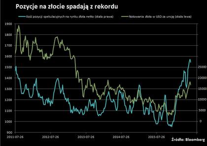 W tygodniu zakończonym w ubiegły wtorek wielcy inwestorzy spekulacyjni obcięli pozycje netto obliczone na dalsze umocnienie złota o 5,4 proc., do 271,5 tys. kontraktów. Jeszcze tydzień wcześniej pozycje te były największe w historii. To potwierdza pogorszenie nastawienia do złota, po tym jak na początku lipca notowania kruszcu znalazły się najwyżej od dwóch lat. Od szczytu intraday sprzed dwóch tygodni ceny żółtego metalu zniżkowały o 3,7 proc., w miarę jak inwestorzy na chłodno zaczęli oceniać wpływ brexitu na globalną gospodarkę, a z USA nadeszły lepsze dane, posyłając indeks niespodzianek makroekonomicznych Citigroup dla USA do najwyższego poziomu od półtora roku.