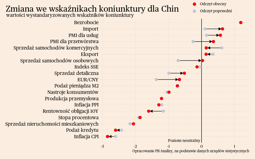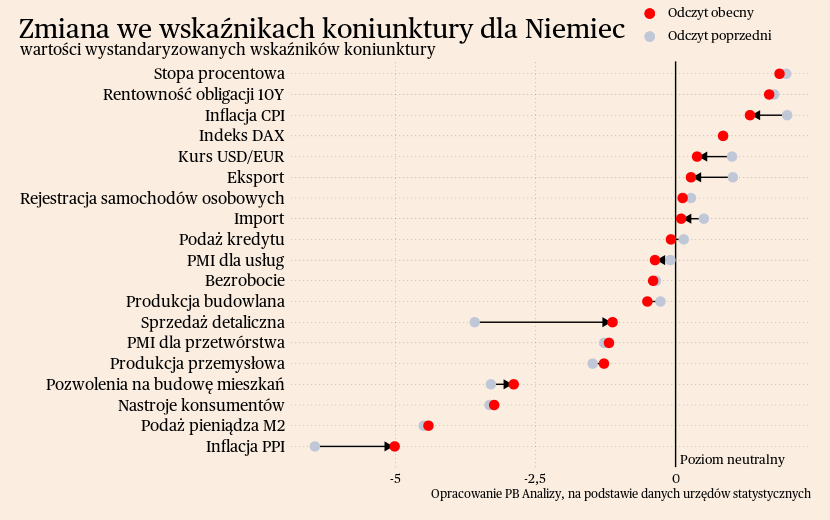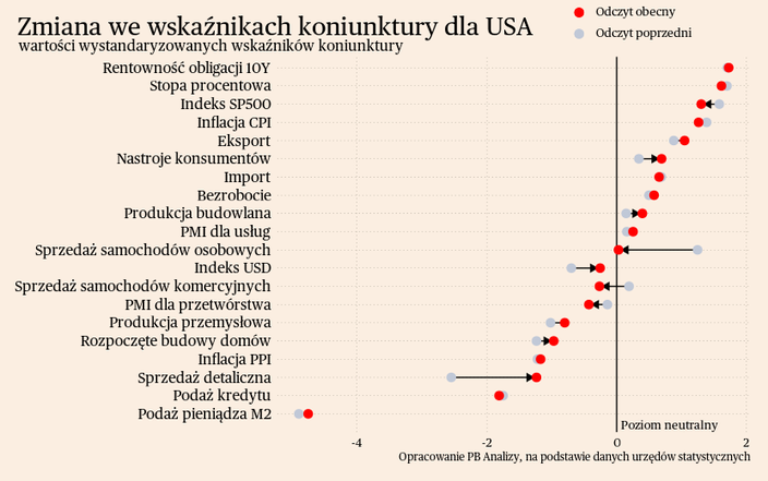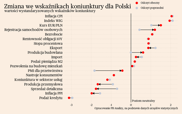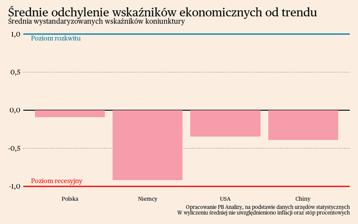.W każdym tygodniu aktualizujemy informacje o kondycji światowej gospodarki przez pryzmat 80 wskaźników z czterech gospodarek – Polski, Niemiec, Stanów Zjednoczonych i Chin. Wszystkie analizowane przez nas wskaźniki można obserwować i pobierać na naszej platformie danych PB Analizy. Na wykresach dane podajemy w wystandaryzowanej dynamice rocznej oraz w wystandaryzowanym odchyleniu od trendu. Dzięki temu możemy porównywać dane o różnych cechach statystycznych.